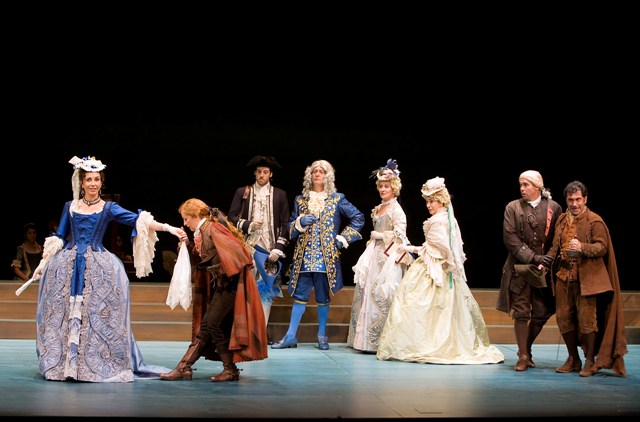 Si bien esta obra parece estar escrita en los años centrales del siglo XVII, tanto el vestuario como la música empleada en esta producción, dirigida y versionada por el director de la compañía, Eduardo Vasco, nos sitúan casi cien años después, en el crepuscular y anciano siglo XVIII. Curiosamente, por aquel entonces, un día de mayo de 1764 llegó al Madrid de Carlos III el hijo de un relojero francés con la misión paterna de arreglar unos asuntos de familia. Aranjuez, Segovia y la Granja fueron las ciudades que visitó durante toda su estancia, al tiempo que pudo acudir a los actos sociales de la realeza y la aristocracia españolas. Tras casi un año de viaje, volvería a París. Aquella experiencia dejó una experiencia imborrable en el visitante. “Mi inagotable humor no me abandonó ni un instante”, confesaría un joven Pierre-Augustin Caron de Beaumarchais. El mismo que, años después, daría al teatro francés las famosas comedias El barbero de Sevilla y Las bodas de Fígaro. Rossini y Mozart verían en ellas las historias propicias para componer dos de sus óperas más conocidas.
