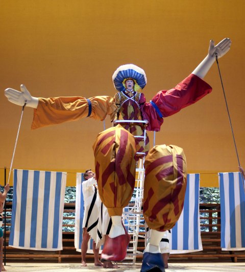 Pero quizá el meollo de esta nueva producción está en ese otro encontronazo, el de las culturas que, a la larga, se vuelve enriquecedor, donde siempre se produce un intercambio. El personaje que encarna esa transformación es Taddeo, que llega a Argel en el mismo barco secuestrado que Isabella. Le veremos al comienzo con su traje occidental y su sombrero de copa, y terminará la ópera vestido a la turca, uniendo su destino a su nuevo patrón, el bey Mustafá. El bajo Carlos Chausson se convirtió en el triunfador de la noche, con un personaje construido con la singular vis cómica que exigen los personajes bufos de Rossini y propuestas escénicas como las de Comediants.