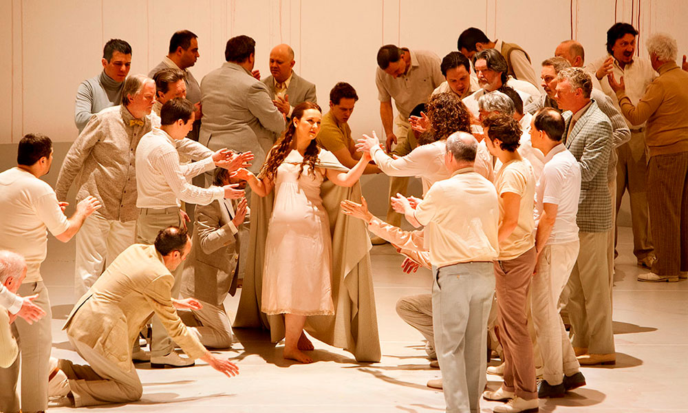 Hace cinco años, Tatiana Gürbaca aceptó la propuesta de la Ópera de Flandes de releer Parsifal, acaso la más «sagrada» de las óperas wagnerianas, la que más riesgos conlleva plantear lecturas alternativas, bien por la complejidad de la trama, bien porque acercarse a ella todavía conserva cierto aire de profanación. La directora de escena alemana decidió acercarse al mito parsifaliano haciendo una exégesis de sus propios símbolos: el Grial, que contuvo la última sangre de Cristo, o la herida de Amfortas, que no se cierra. En las dos, la sangre es lo determinante, lo que confiere vida o la quita. El hombre es visto aquí como una especie de ánfora que contiene un precioso líquido, ese que confiere la mortalidad. Por eso, en el Parsifal de Gürbaca, no hay vaso sagrado, sino que la vasija es una mujer embarazada, la que contiene y da la vida. Sobre un escenario en blancos y pastel, las gotas de sangre manan con la lentitud de un reloj de arena.
