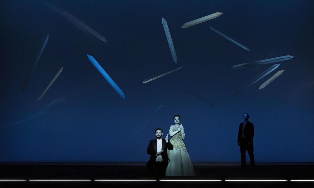 Cabe preguntarse a priori cómo le sentaría la música de Verdi a una propuesta escénica como la de Bob Wilson, tan estática, cromática y conceptual. Al final, el minimalismo del director texano no casa mal con esa melodía verdiana, tan desnuda de artificio orquestal, sobre todo en los pasajes de mayor lirismo. Es en la música de fiesta donde los personajes de Wilson parecen ir algo más desacompasados, pero ese es el misterio de sus propuestas, la capacidad que tienen para ser contempladas. Si los dos primeros actos navegan en un azul intenso, tan sólo adornado por cristales blanquecinos, es en la segunda escena del segundo acto, con el coro de los matadores, donde hace aparición por primera vez del rojo y de los fluorescentes estilo Dan Flavin, utilizados en otras producciones. En el tercer acto, el de la agonía de Violetta, se acentúa aún más el onirismo de la escena, con una cama alargada y angulada en el centro, como salida de una pesadilla.